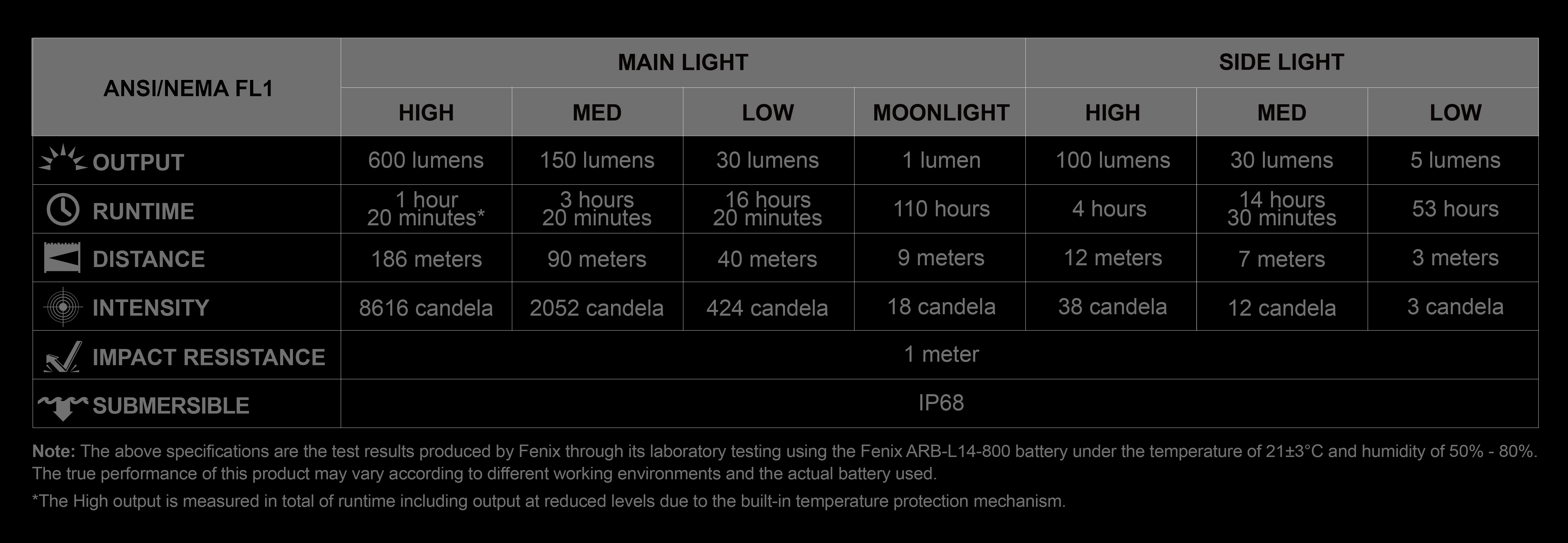 - Высокий – 600 люмен – 8616 кандел – 1 час 20 минут – 186 метров;