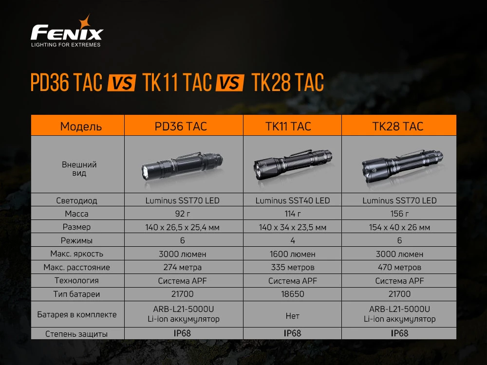 Fenix PD36 TAC (LUMINUS SST70, ANSI 3000 lm, 21700) |